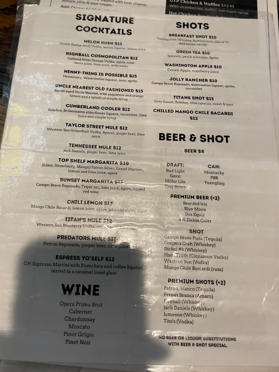 “ We came here for Nashville Hot Chicken week and it was our first time here. We really enjoyed the food and the friendly staff and will definitely seek to come back to enjoy their other offerings as the menu has many interesting sounding choices. I would not recommend the wings appetizer for the price as they were very tasty but very small, however, I do highly recommend the meatballs appetizer as they were both delicious and a decent sized portion for the price. Parking can be very tough so be aware that you may have to walk a bit from where you can find a parking spot. ”